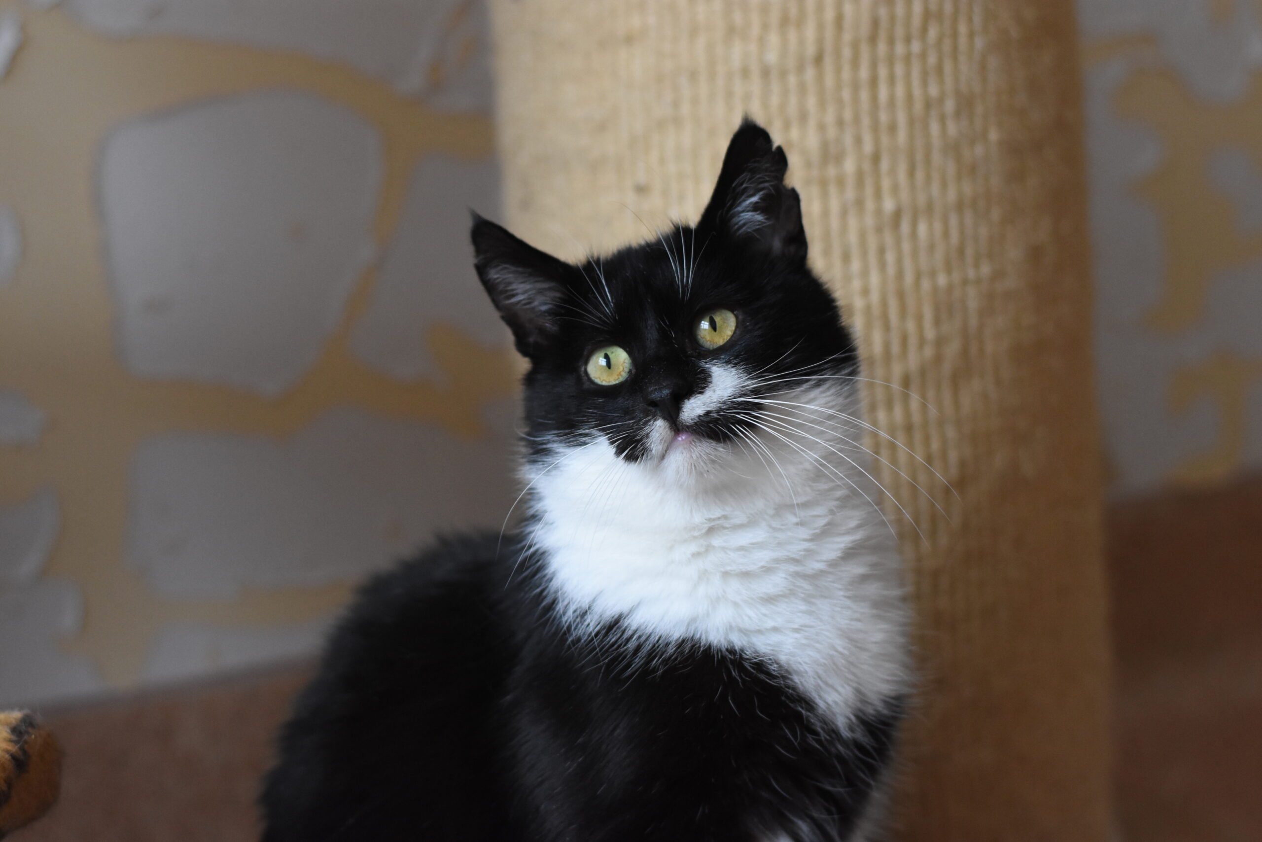 Pozwolił jej się wygłaskać podczas odpoczynku na drapaku. Z ciekawością reaguje na próby zabawy wędką.