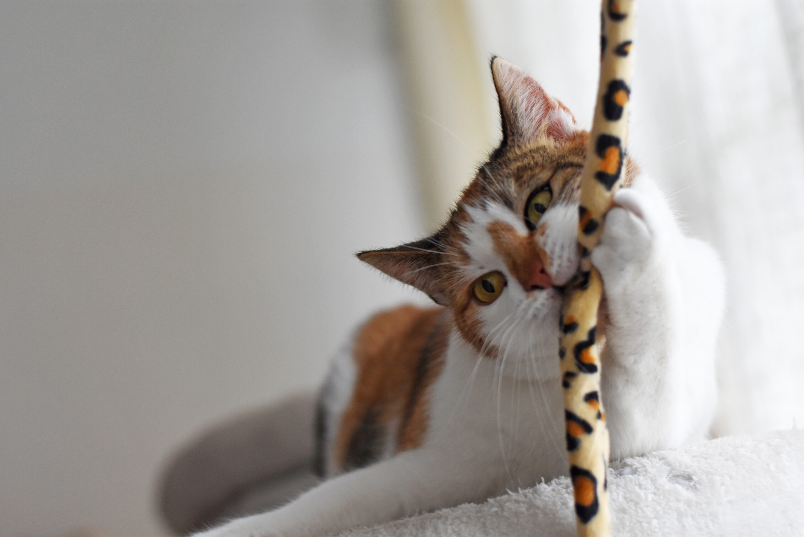 Uwielbia zabawy, zwłaszcza te z wędką i w proszenie o więcej np. o więcej jedzonka, o więcej pasty smakowej, o więcej przysmaków.