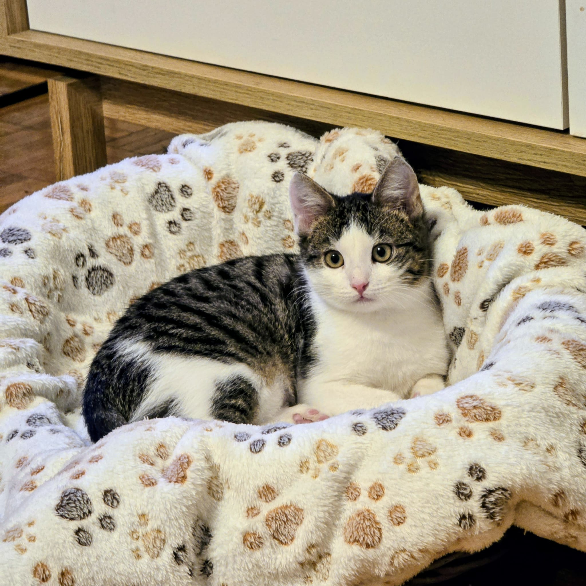 Chłopak został zaszczepiony, odrobaczony, zaczipowany, jest FIV/FeLV ujemny, niedługo zostanie wykastrowany. Jest w Toruniu, domu szuka w całej Polsce. Urodził się późnym latem 2025.