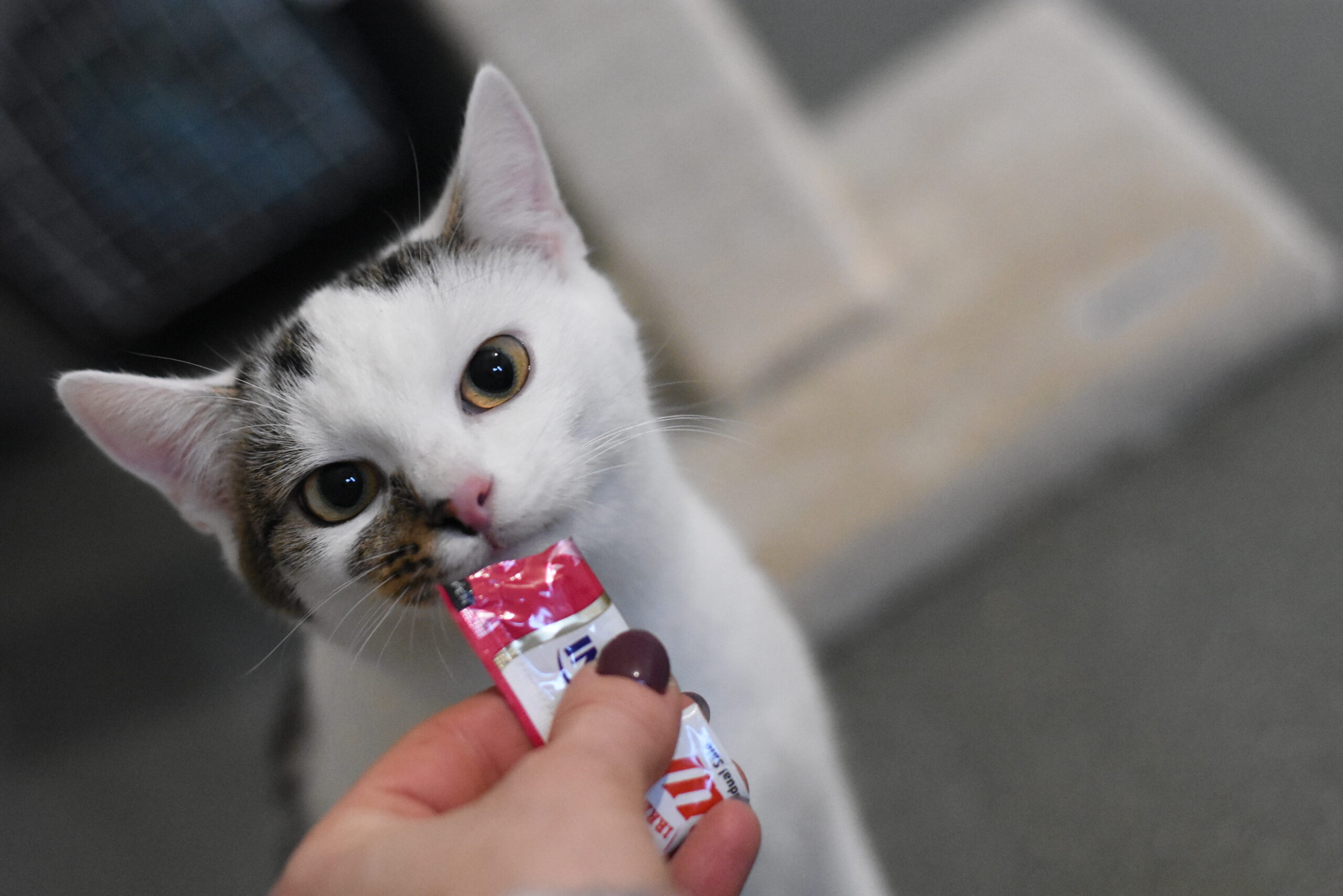 Leoś daje się złapać na wizyty u weterynarza, chętnie zje coś z ręki, a palec ubrudzony w Churu wylizuje do czysta (serio — nikt tak dokładnie nie myje palców jak Pirania:)). Uwielbia też zabawy: ganianie wędki, na której końcu jest człowiek, albo polowanie na rzuconą piłkę.