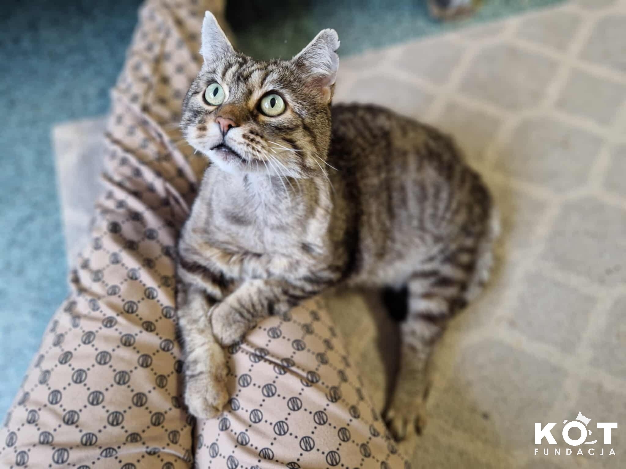 Kocurek ur. wiosną 2014 roku. Pewnego dnia leżał na osiedlowym trawniku. Okazało się, że nie mógł chodzić, miał uszkodzone obie przednie łapki. Jedna była złamana, druga z bardzo bolesnym ropniem. Po otrzymaniu pomocy i rozpoczęciu leczenia kocurek bardzo szybko zaczął dochodzić do siebie i jeszcze podczas rekonwalescencji w klatce wiedzieliśmy, że będzie z niego niezły….czubek. Rozpierała go energia i tak pozostało. Czubek będzie idealnym towarzyszem dla innego energicznego, młodego kota, który uwielbia szalone gonitwy i ekspresyjne zabawy. W stosunku do człowieka Czubek jest płochliwy, ale coraz bardziej się przekonuje, towarzyszy, podgląda różne czynności wykonywane w fundacji i czeka na zabawę piórkami na wędce.