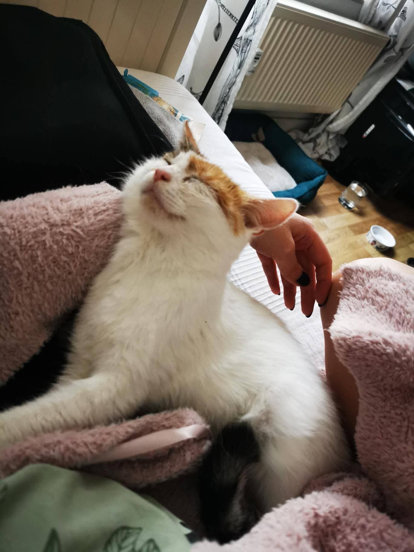 Kotka ur. w 2013 roku. Kiedy patrzymy na jej pyszczek, pierwsze nasze skojarzenie to buldożek. Zapodziały się gdzieś tam u kici „plaskate” geny. Zapewne wraz z nimi otrzymała także pewną charakterystyczną przypadłość kotów z krótką trzewioczaszką – zarośnięte kanaliki łzowe i punkt łzowy, przez co kotka ma często załzawione oczka. Buldożka to delikatna, zwinna i drobna kotka – trzpiotka. Idealnie nadaje się na towarzystwo dla innego kota/kotów. W stosunku do ludzi jest przyjazna, lecz płochliwa, potrzebuje trochę czasu, żeby zaufać. Uwielbia zabawę w aportowanie, z upodobaniem przynosi rzucane myszki, a potem się nimi bawi.