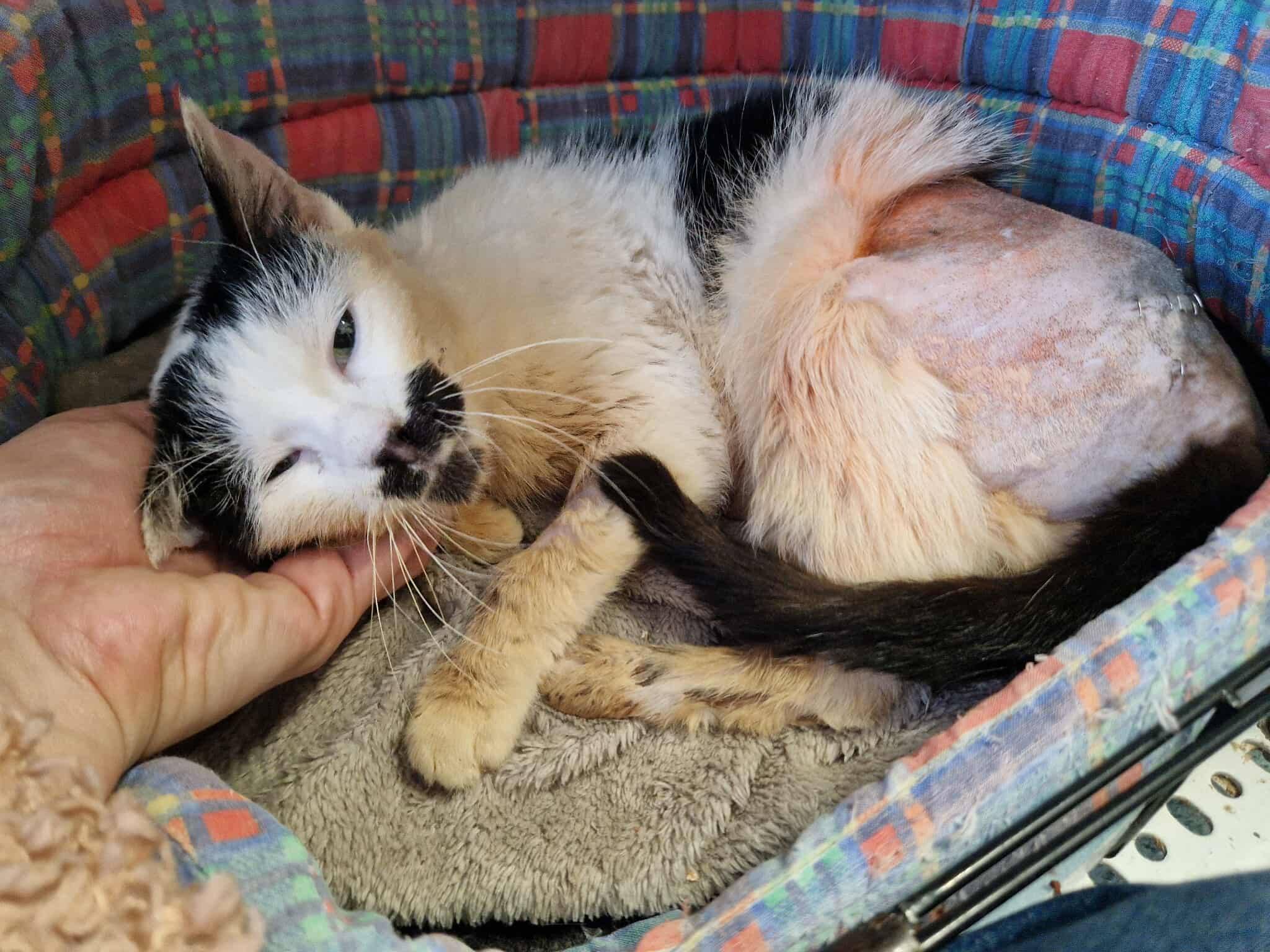 Kotka trafiła do nas z poważnym urazem – złamanym kręgosłupem ogonowym. Ogon był do amputacji. Kotka czuje się bardzo dobrze, choć ma problem ze świadomym oddawaniem kału i moczu – pracujemy nad tym. Rokowania: być może kotka zareaguje na leki i rehabilitację i się jej poprawi, a być może będzie miała z tym problem do końca życia.