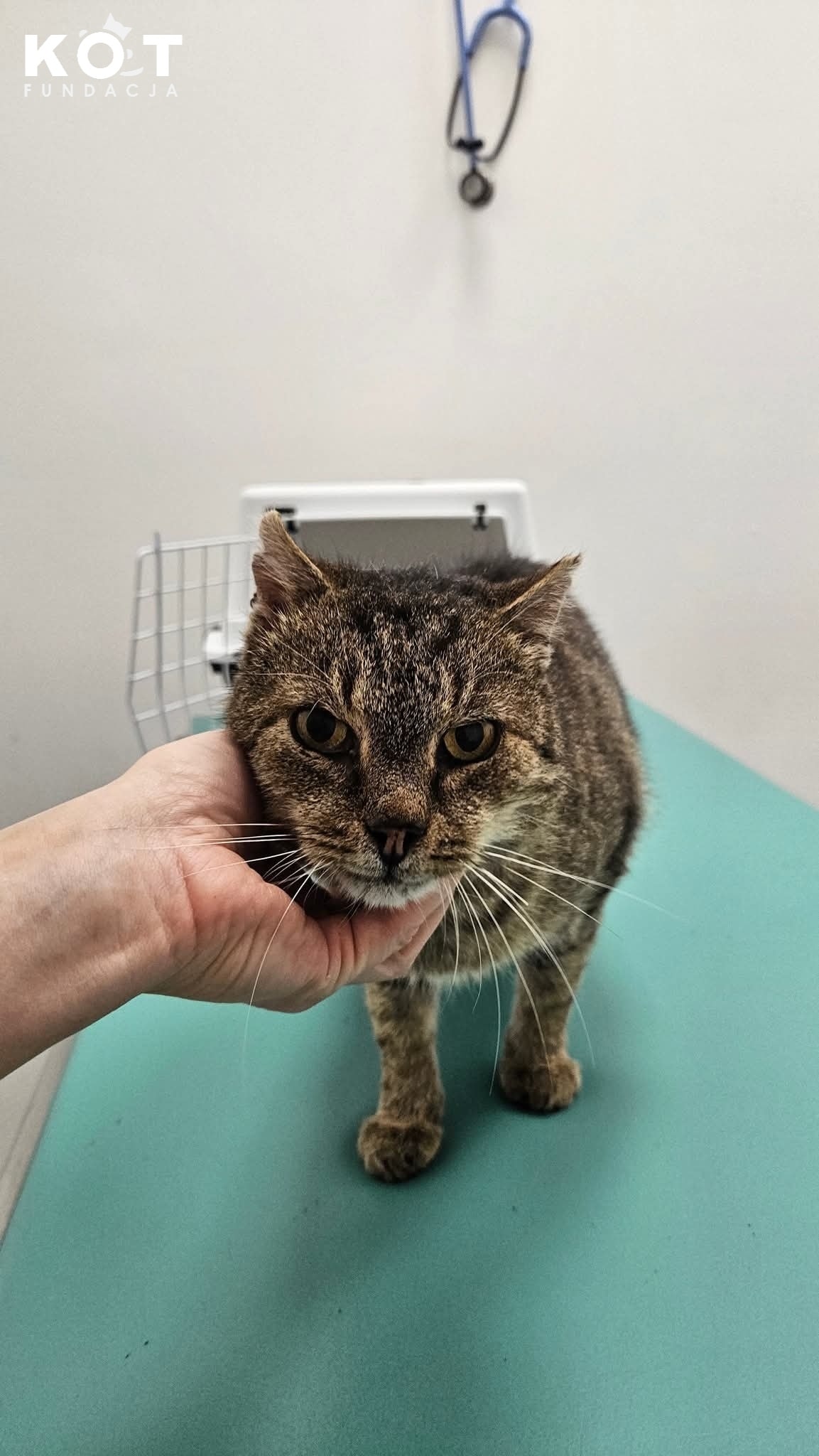 Bass z krzywą głową przyjechał do nas na kastrację, został złapany w samą porę… Okazało się, że ma infekcję oskrzeli i górnych dróg oddechowych. W uszach ogromny świerzb, w jednym doszło już do perforacji ścian ucha i leje się z niego ropa, a kocur ma objawy zespołu przedsionkowego. Kastracja musiała poczekać, niech najpierw chłopak stanie na nogi.