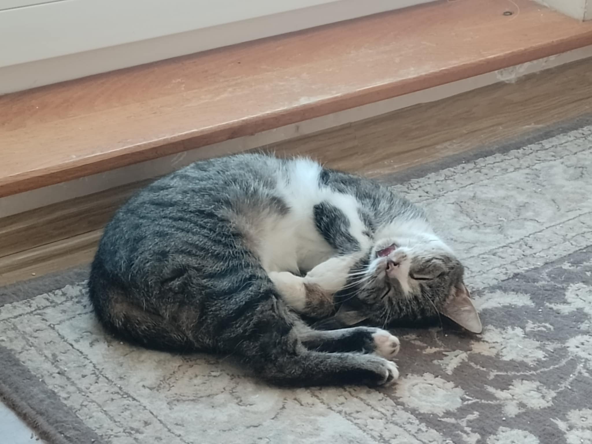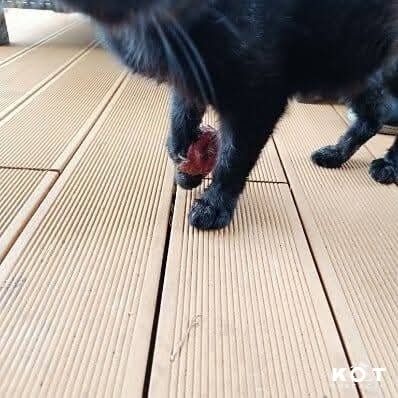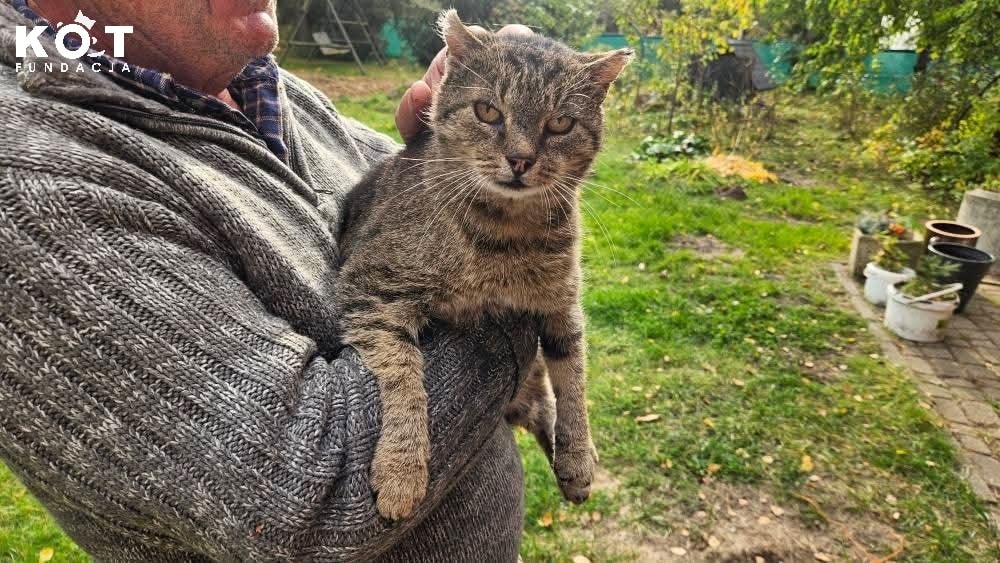 Ten kot kilka lat temu pojechał na gminną kastrację, wrócił z niej ze złamaną nogą. Nikt nie poinformował o tym karmicieli. O tym, że coś jest nie tak, dowiedzieli się, kiedy po odbiorze kota z gabinetu wypuścili go w miejscu bytowania, a ten pobiegł w siną dal. Szkoda tylko, że ciągnął za sobą nogę… Kot wrócił po tygodniu i przez 8 lat nie dał się złapać. Dopiero latem 2024 roku się to udało. Najprawdopodobniej przez to, że się gorzej poczuł.