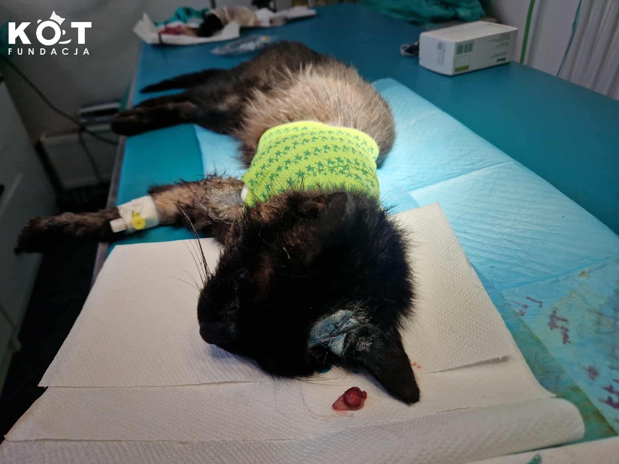 Po dokładnym obejrzeniu kocurka lekarze znaleźli jeszcze jednego guzka na głowie, który też został usunięty. Czekamy na wynik badania histopatologicznego. Kocurek miał badania krwi, został przetestowany na FIV/FeLV (ujemne) i przy okazji został wykastrowany.